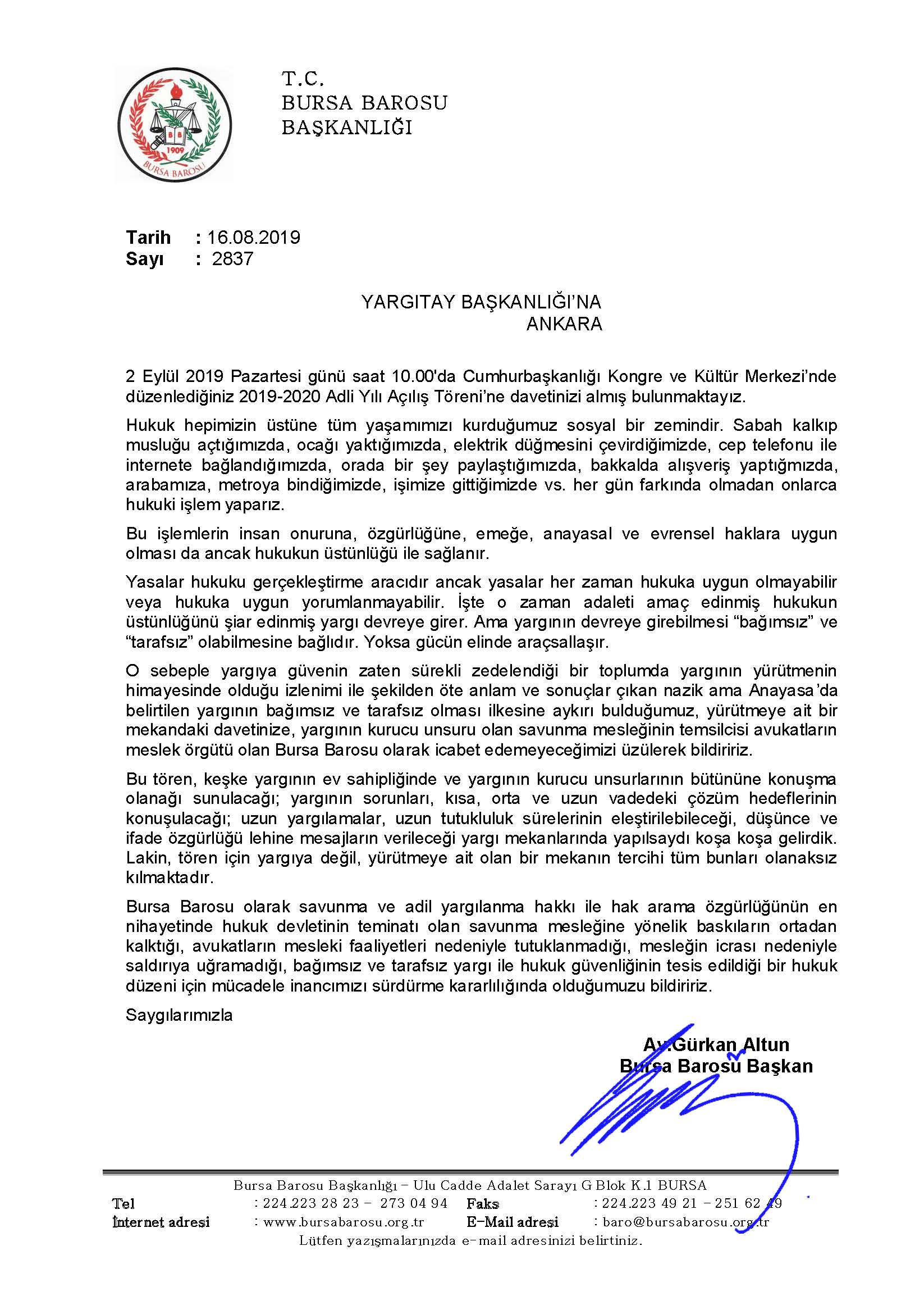Yargıtay Başkanlığı'nca Cumhurbaşkanlığı Kongre ve Kültür Merkezi'nde 2 Eylül günü yapılacak yeni adli yıl açılış töreni davetini Bursa Barosu da reddetti. Bursa Barosu Başkanı Av. Gürkan Altun, davete katılmayacağını bildirdiği yazısında “yargıya güvenin zaten sürekli zedelendiği bir toplumda, yargının yürütmenin himayesinde olduğu izlenimi ile şekilden öte anlam ve sonuçlar çıkan nazik ama Anayasa'da belirtilen yargının bağımsız ve tarafsız olması ilkesine aykırı bulduğumuz, yürütmeye ait bir mekandaki davetinize icabet edemeyeceğiz” dedi.