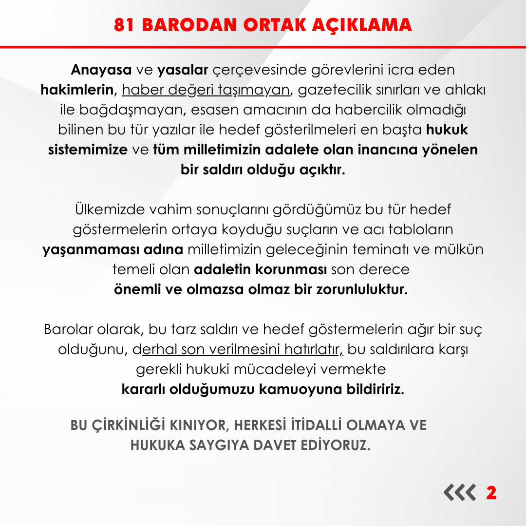 Barolar olarak, bu tarz saldırı ve hedef göstermelerin ağır bir suç olduğunu, derhal son verilmesini hatırlatır, bu saldırılara karşı gerekli hukuki mücadeleyi vermekte kararlı olduğumuzu kamuoyuna bildiririz.