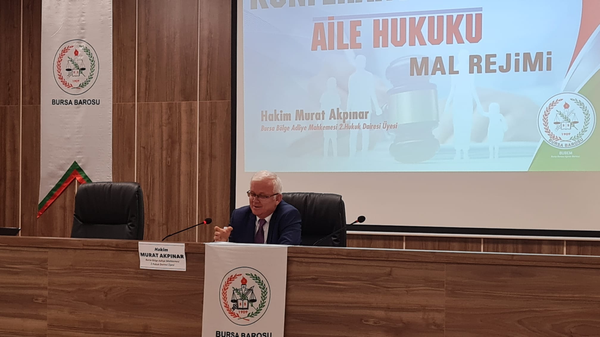 Bursa Barosu Eğitim Merkezi BUBEM tarafından düzenlenen Aile Hukuku Mal Rejimi konferansı Bursa Bölge Adliye Mahkemesi konferans salonunda gerçekleştirildi. BAM 2. Hukuk Dairesi üyesi Hakim Murat Akpınar'ın verdiği konferansa avukatlar yoğun ilgi gösterdi. Konferans sonunda Hakim Akpınar'a Bursa Barosu Genel Sekreteri Av. Yener Poroy anı plaketi verdi.