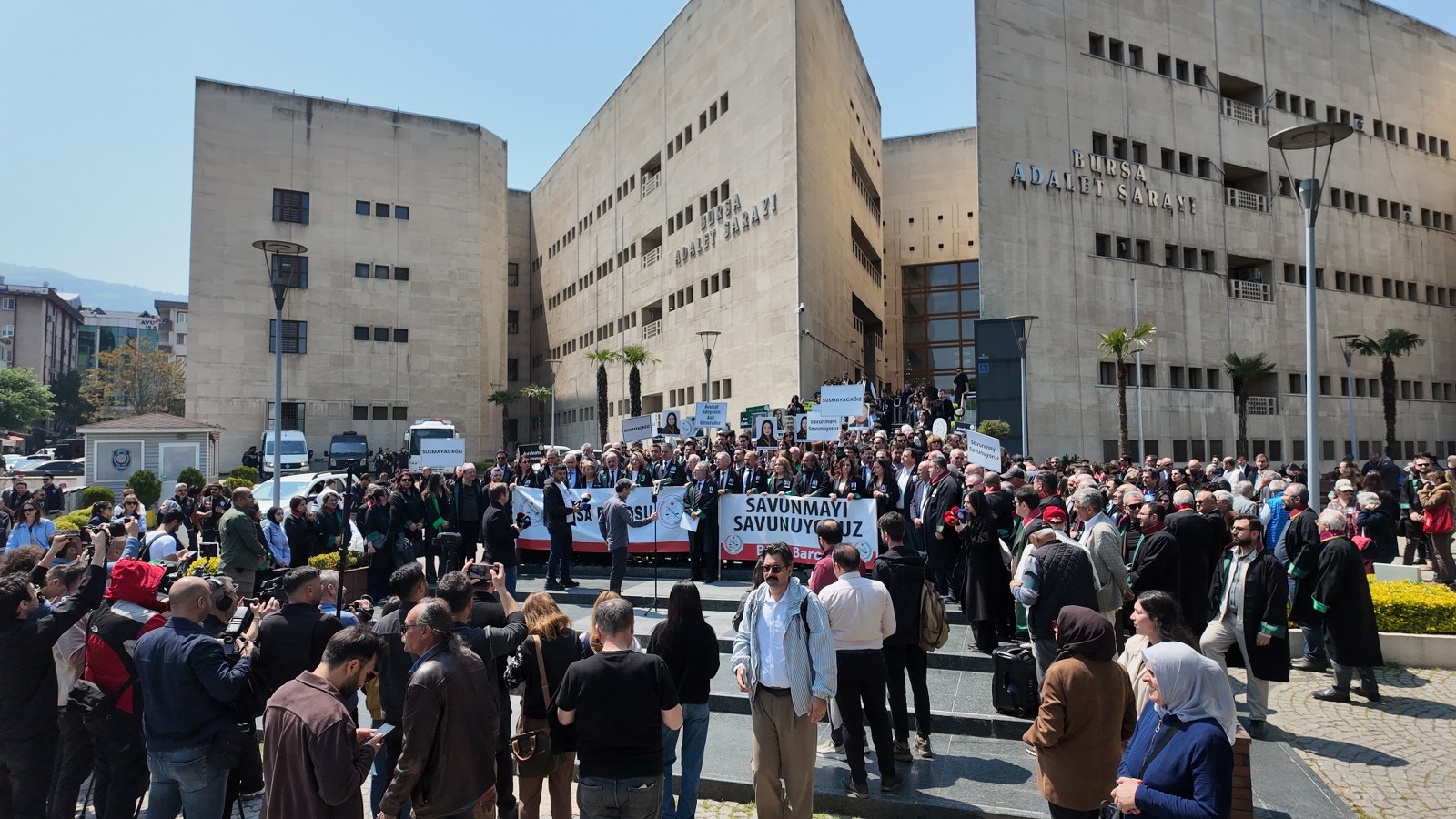 Bursa Adalet Sarayı önündeki basın açıklamasına Bursa Barosu'nun yanı sıra, TBB Başkanı Erinç Sağkan, İstanbul Barosu Başkanı Av. Prof. Dr. İbrahim Kaboğlu, İzmir Barosu Başkanı Sefa Yılmaz, Gaziantep Barosu Başkanı Av. Bülent Duran, Manisa Barosu Başkan Yardımcısı Av. Mehmet Tarlabölen, Giresun Barosu Başkanı Av. Soner Karademir, Sakarya Barosu Başkanı Av. Musa Adıyaman, Kocaeli Barosu Başkanı Av. Kadir Caner Karakadılar, Balıkesir Baro Başkanı Av. Hakan Topaloğlu ile yönetim kurulu üyeleri, Bursa Barosu önceki dönem başkanları Av. Asude Şenol, Av. Gürkan Altun ile avukatlar katıldı.