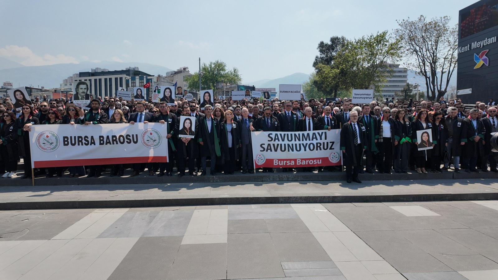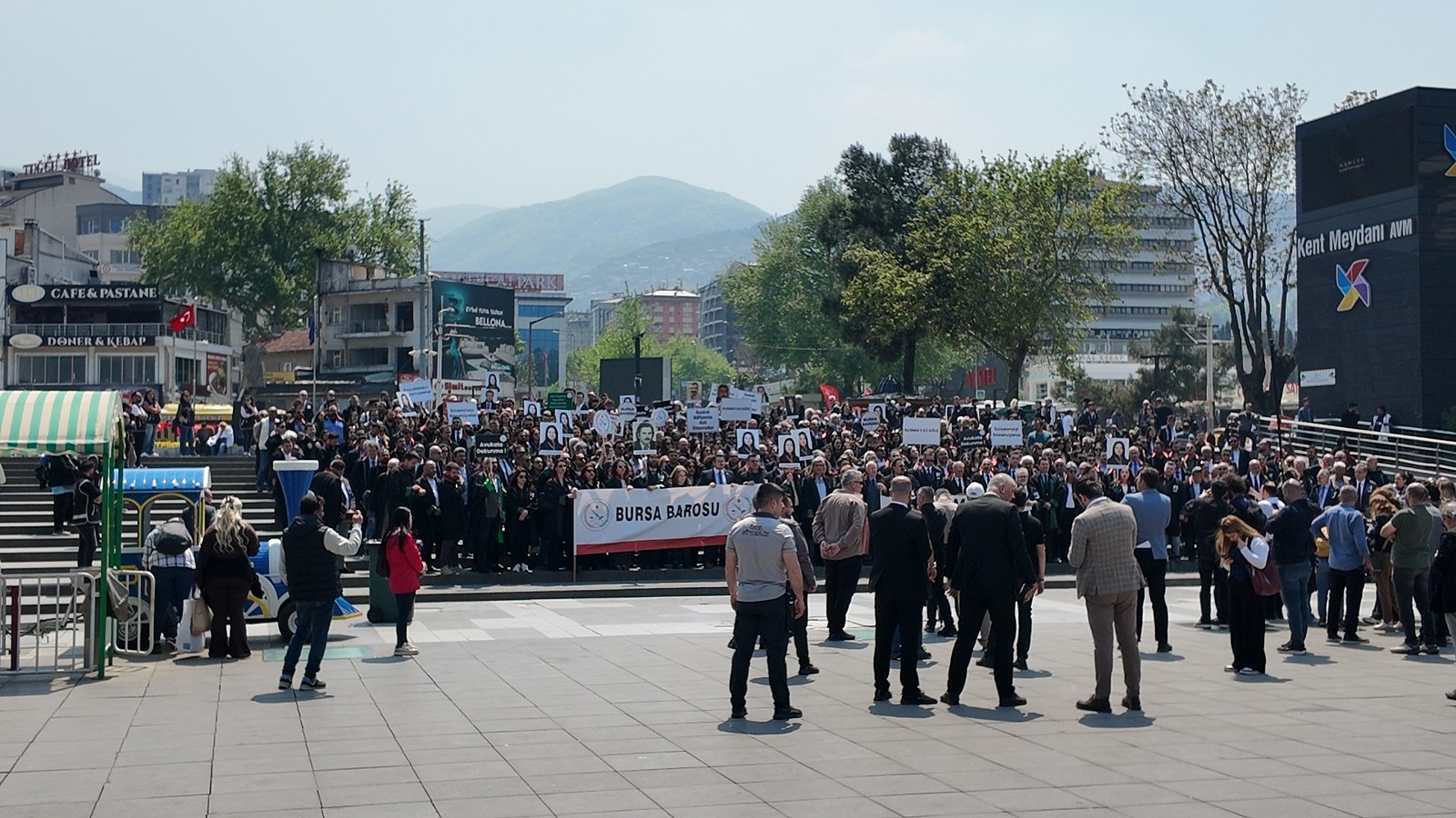 Açıklamaların ardından baro başkanları ve avukatlar, Kıbrıs Şehitleri Caddesi boyunca sloganlar atarak Kent Meydanına yürüdü. Burada Bursa Barosu Başkanı Av. Metin Öztosun, şimdiye kadar katledilen avukatların isimlerini saydı, katılımcılar “burada” diye haykırdı. Eylem, meslek şehitleri için yapılan saygı duruşu ile sona erdi.