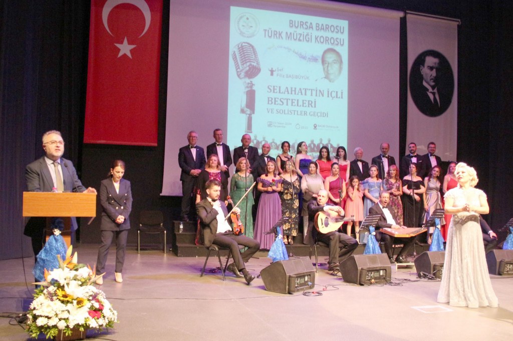 Bursa Barosu Türk Müziği Korosu, BAOB Oditoryum'da muhteşem bir konser gerçekleştirdi. Filiz Başıbüyük şefliğinde “Selahattin İçli Besteleri ve Solistler Geçidi” başlığı altında sahne alan avukatlar, birbirinden güzel eserleri, profesyonelleri aratmayacak şekilde seslendirdi. Bursa Barosu Başkanı Av. Metin Öztosun'un da izleyip, koroya katılarak bazı şarkılara eşlik ettiği konseri izleyenler, Türk müziğinden geniş bir yelpazede eserlerle hoş bir bahar akşamı yaşadı. Konser sonunda Bursa Barosu Başkanı Öztosun, Şef Filiz Başıbüyük'e çiçek verdi.