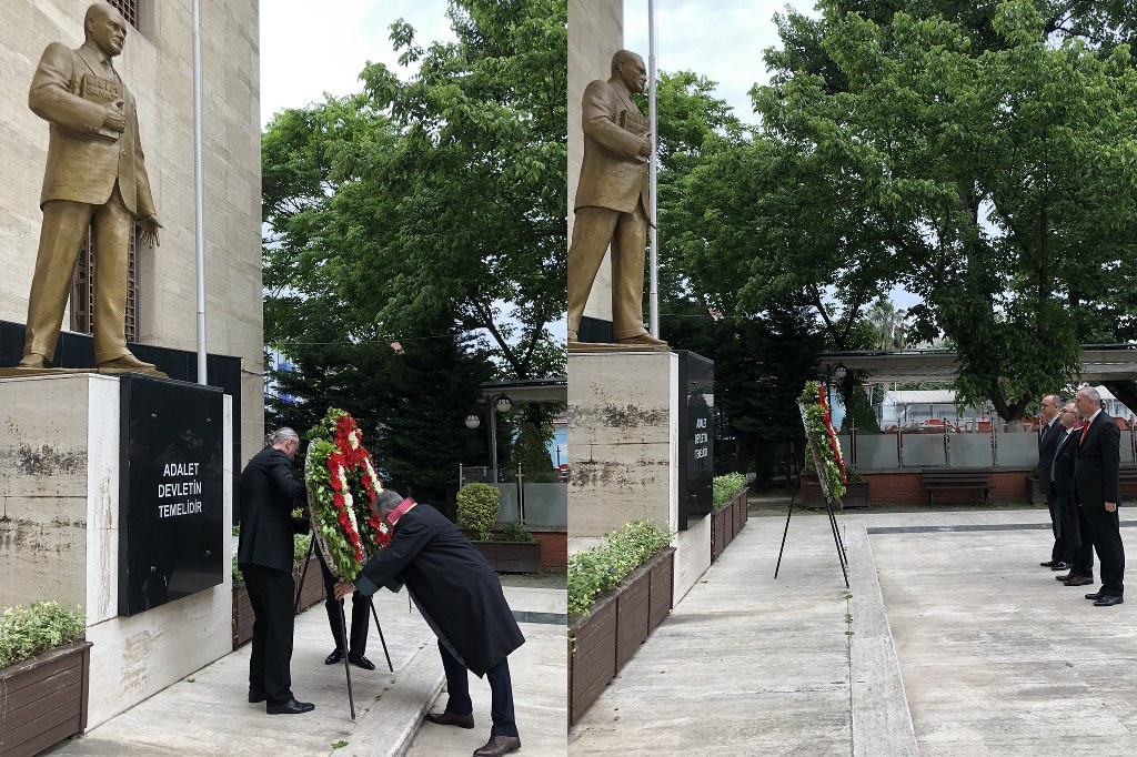 Bursa Barosu, 19 Mayıs Atatürk'ü Anma, Gençlik ve Spor Bayramı'nı, Adalet Sarayı Atatürk Anıtı önünde kutladı. Bursa Barosu Başkanı Av. Metin Öztosun'un Atatürk Anıtı'na çelenk sunmasının ardından saygı duruşunda bulunuldu ve İstiklal Marşı okundu. Törene katılan meslektaşlarına hitaben konuşan Bursa Barosu Başkanı Öztosun, “19 Mayıs 1919, geldikleri gibi giderler diyen büyük bir önderin sonradan bir Anadolu ihtilali ile Cumhuriyet devrimine dönüşecek olan yolun başlangıcındaki attığı ilk adımıdır. 19 Mayıs 1919, ne kadar unutturmaya çalışırlarsa çalışsınlar ufkumuzu göz kamaştıran ışığıyla aydınlatmaya devam eden Gazi Mareşal Mustafa Kemal Atatürk'ün doğum gününün adıdır. Tüm bu sebeplerle; bu günü geleceğimizin teminatı ve umudu olan gençlere armağan eden Atatürk'ü ve mücadele arkadaşlarını şükranla anıyor, 19 Mayıs Atatürk'ü Anma, Gençlik Ve Spor Bayramımızı kutluyorum” dedi.