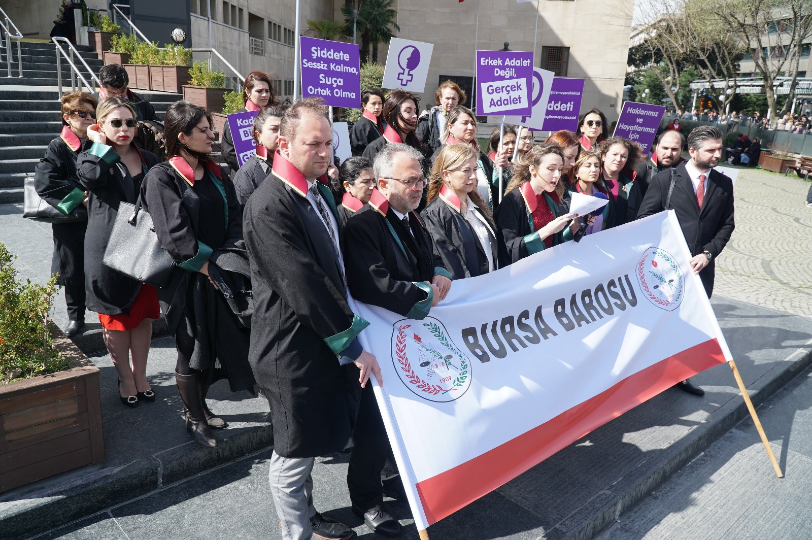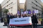 Bursa Barosu Kadın Hakları Merkezi'nce Adalet Sarayı önünde düzenlenen basın açıklamasına, Bursa Barosu Başkanı Av. Metin Öztosun, yönetim kurulu üyeleri, Kadın Hakları Merkezi Yürütme kurulu üyeleriyle avukatlar katıldı.