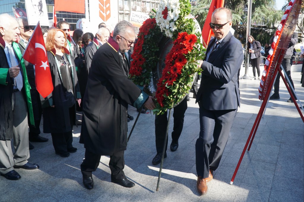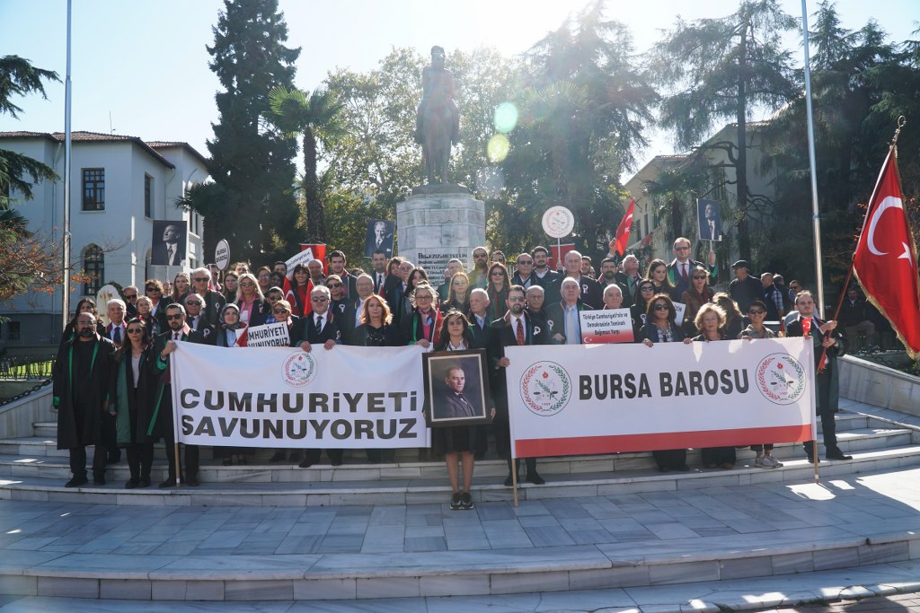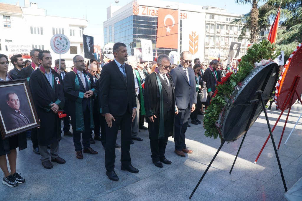Bursa Barosu Başkanı Av. Metin Öztosun, önceki başkanlar Av. İsmail Acar, Av. Asude Şenol ile baro kurullarının üyeleri, YK genç temsilcileri ve avukatlar, "Cumhuriyeti Savunuyoruz" pankartı arkasında, marşlar ve sloganlar eşliğinde Atatürk Anıtı'na yürüdü. Yürüyüş sırasında vatandaşlar alkışlarıyla destek verdi. Öztosun'un, Atatürk Anıtı'na çelenk sunmasının ardından Türkiye Cumhuriyeti'nin kurucusu Mustafa Kemal Atatürk ve şehitler için saygı duruşunda bulunuldu, İstiklal Marşı okundu.