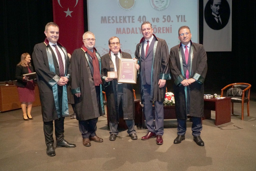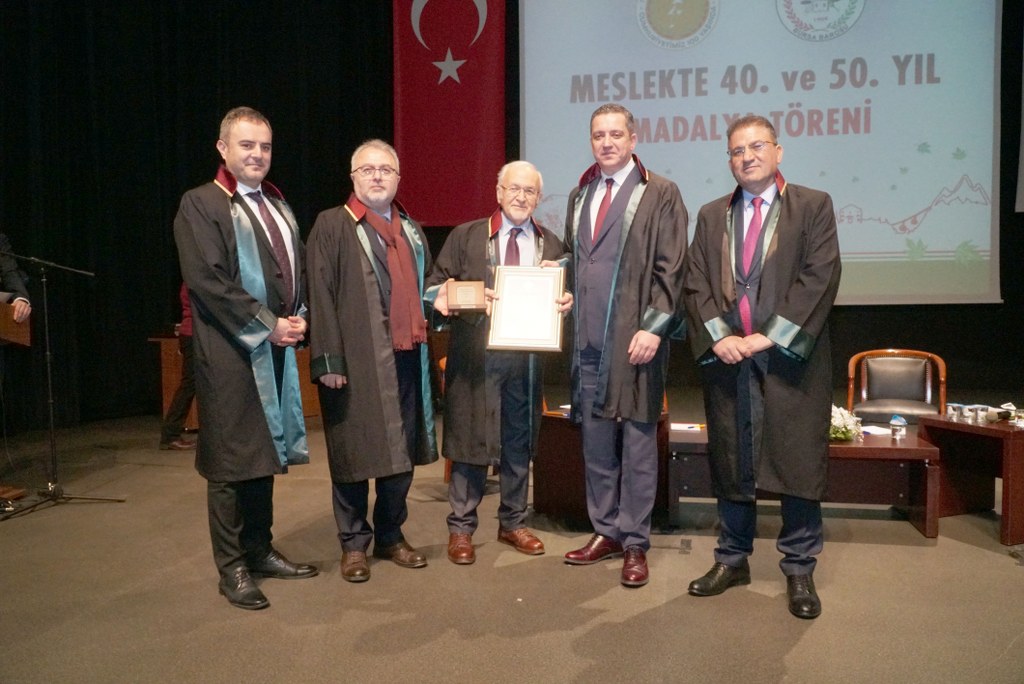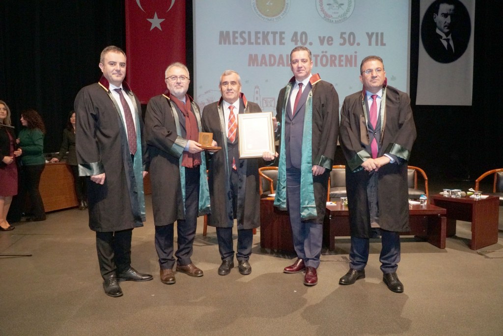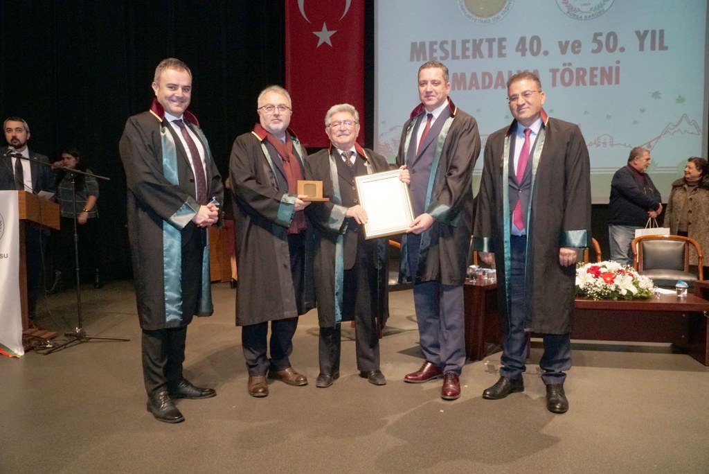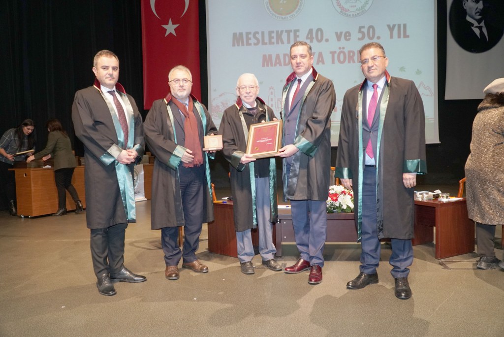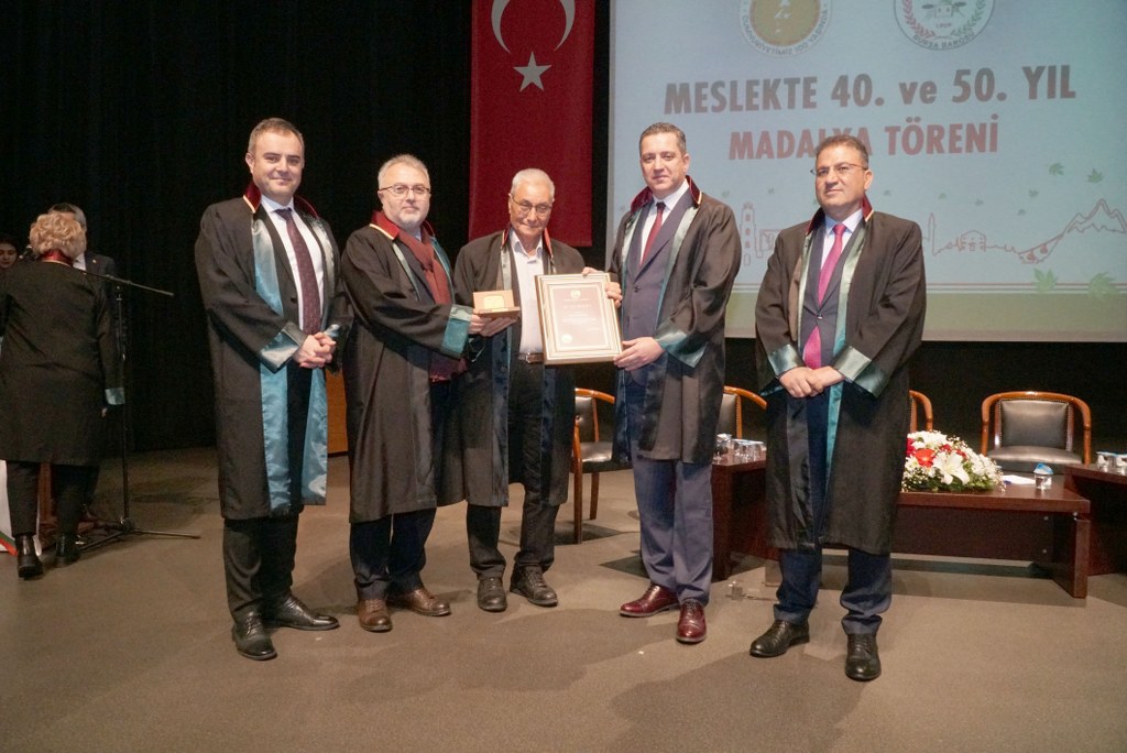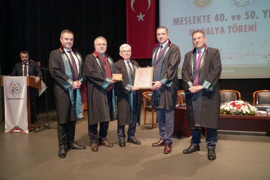 Bursa Barosu Staj Okulu'nun açılışına katılan Türkiye Barolar Birliği Başkanı Av. R. Erinç Sağkan, Başkan Yardımcısı Av. Gürkan Altun, yönetim kurulu üyeleri Av. R. Erhan Toprak ve Av. Nizam Dilek ile Bursa Barosu Başkanı Av. Metin Öztosun'un, meslekte 40 ve 50 yılını dolduran meslektaşlarına madalya ve plaket verdi.