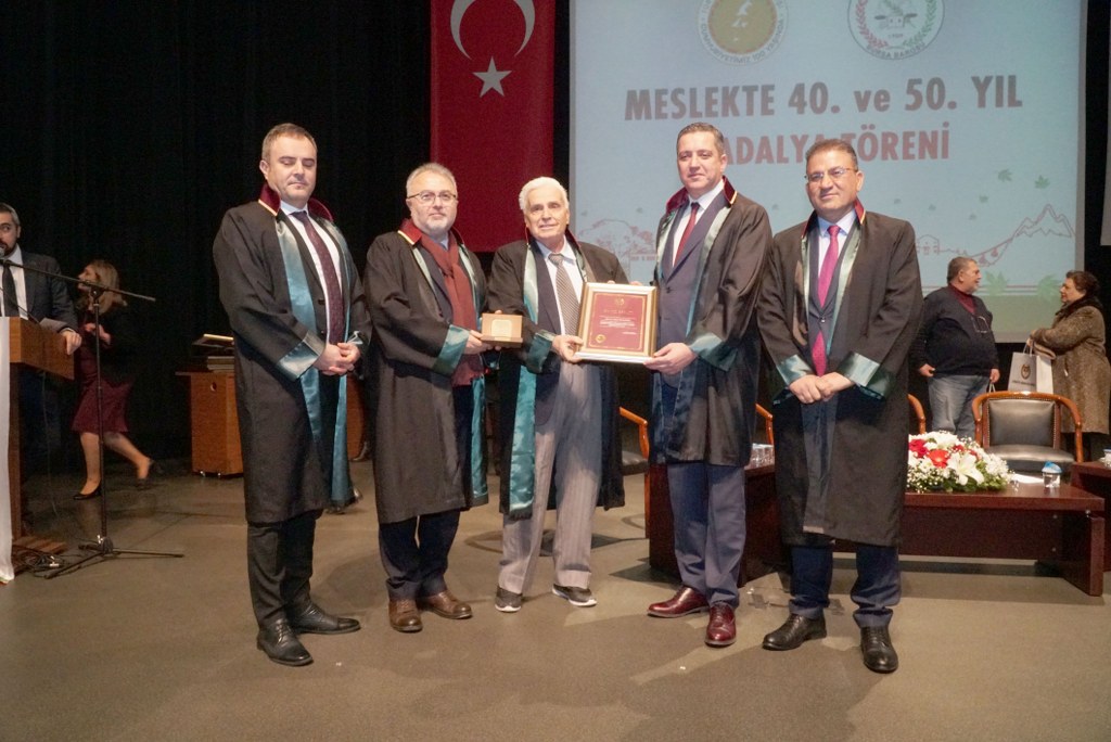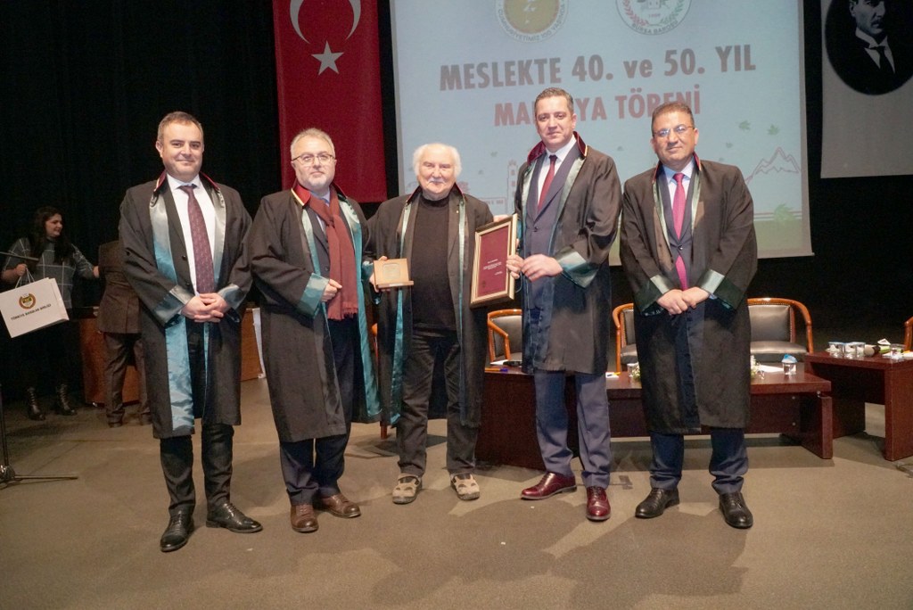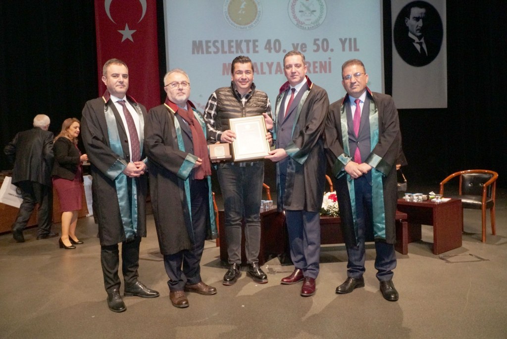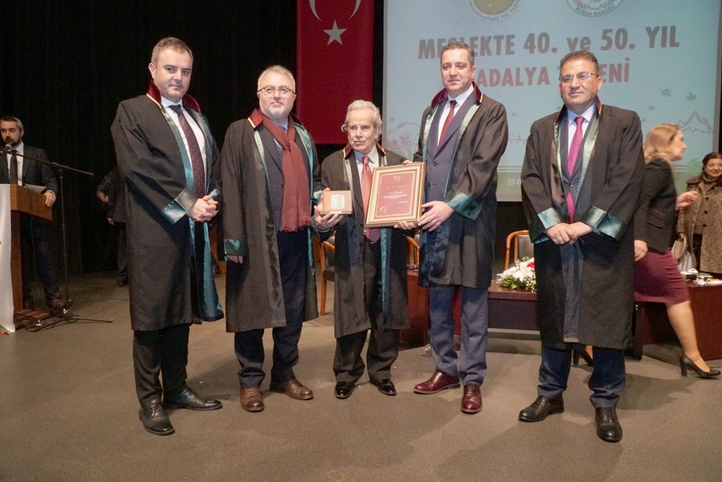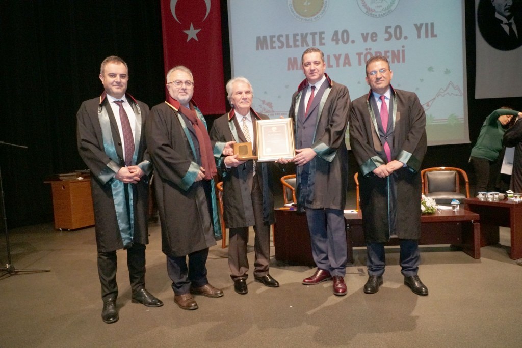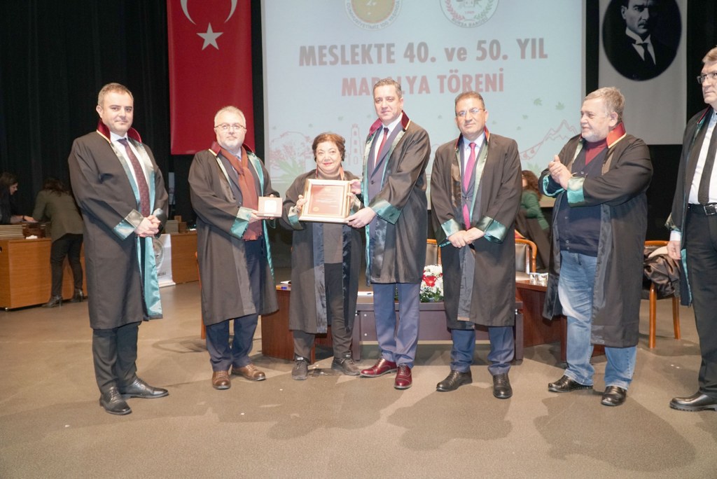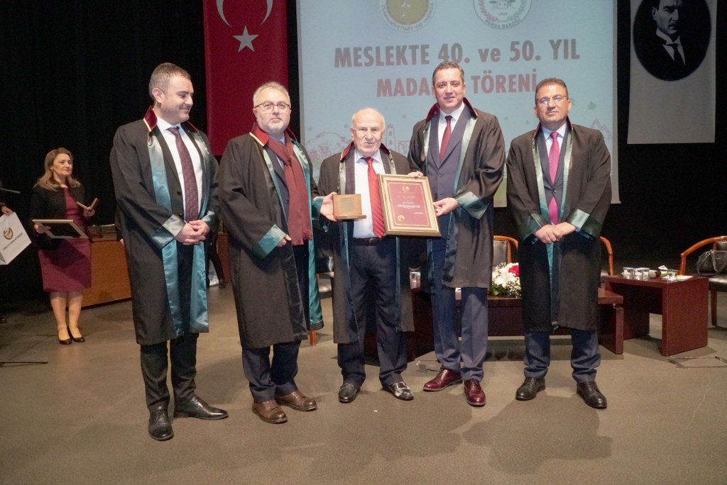 Bursa Barosu Staj Okulu'nun açılışına katılan Türkiye Barolar Birliği Başkanı Av. R. Erinç Sağkan, Başkan Yardımcısı Av. Gürkan Altun, yönetim kurulu üyeleri Av. R. Erhan Toprak ve Av. Nizam Dilek ile Bursa Barosu Başkanı Av. Metin Öztosun'un, meslekte 40 ve 50 yılını dolduran meslektaşlarına madalya ve plaket verdi.