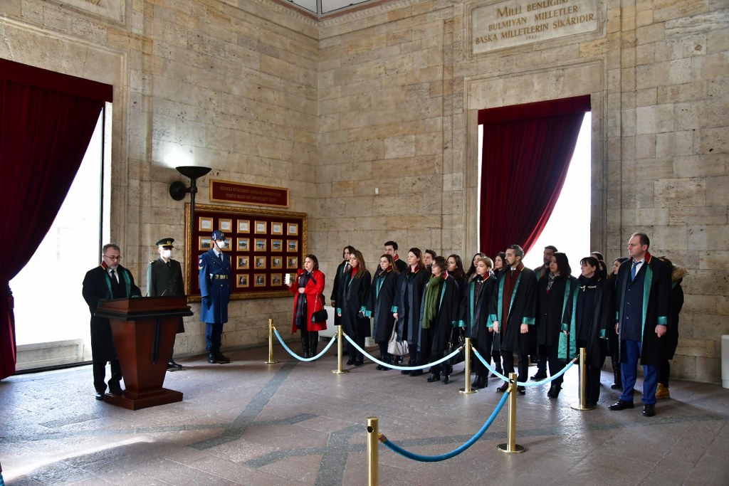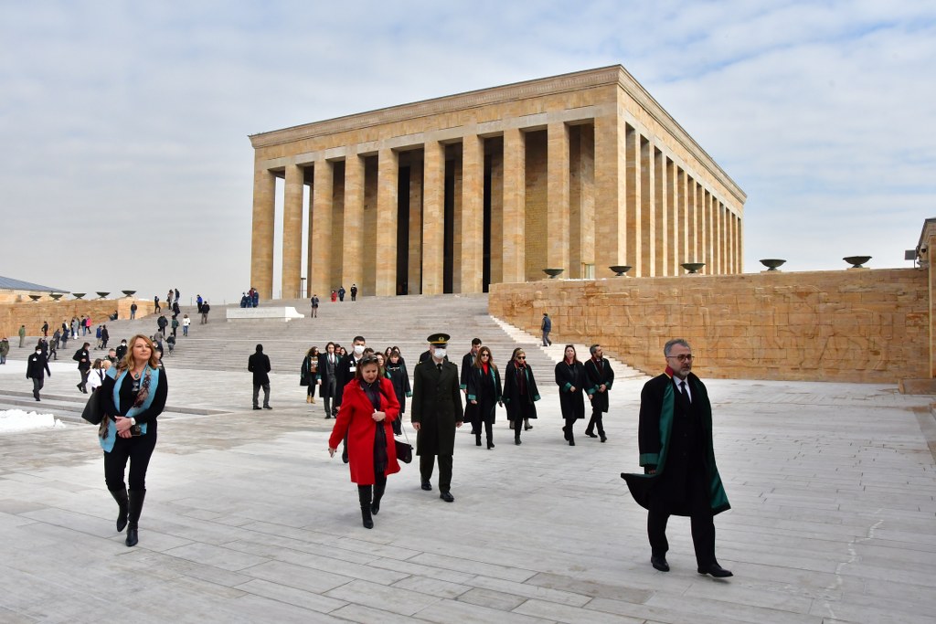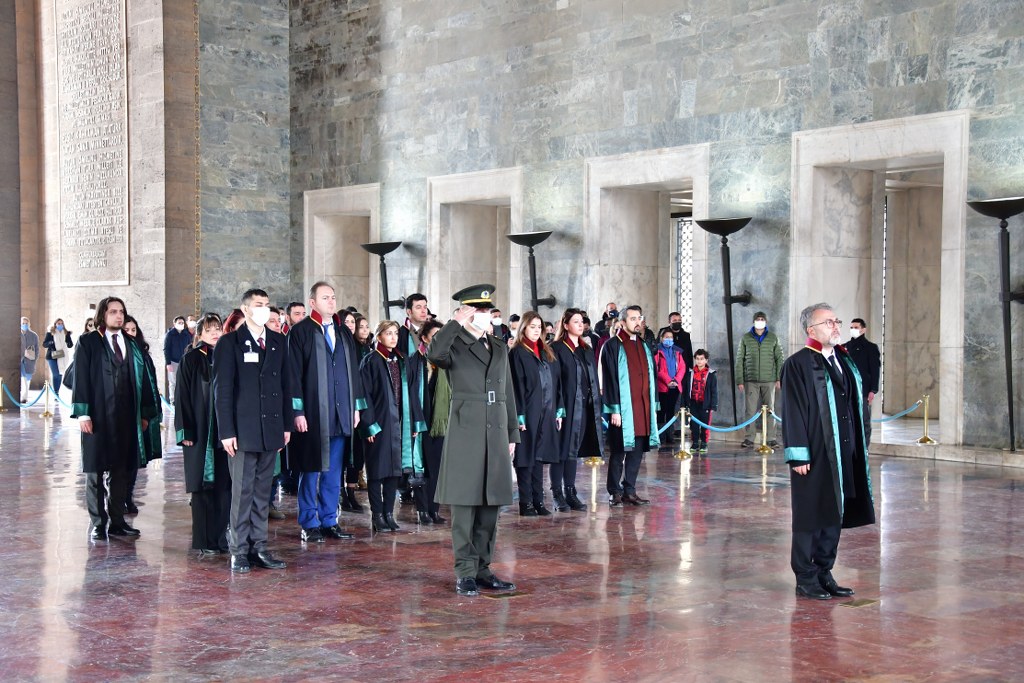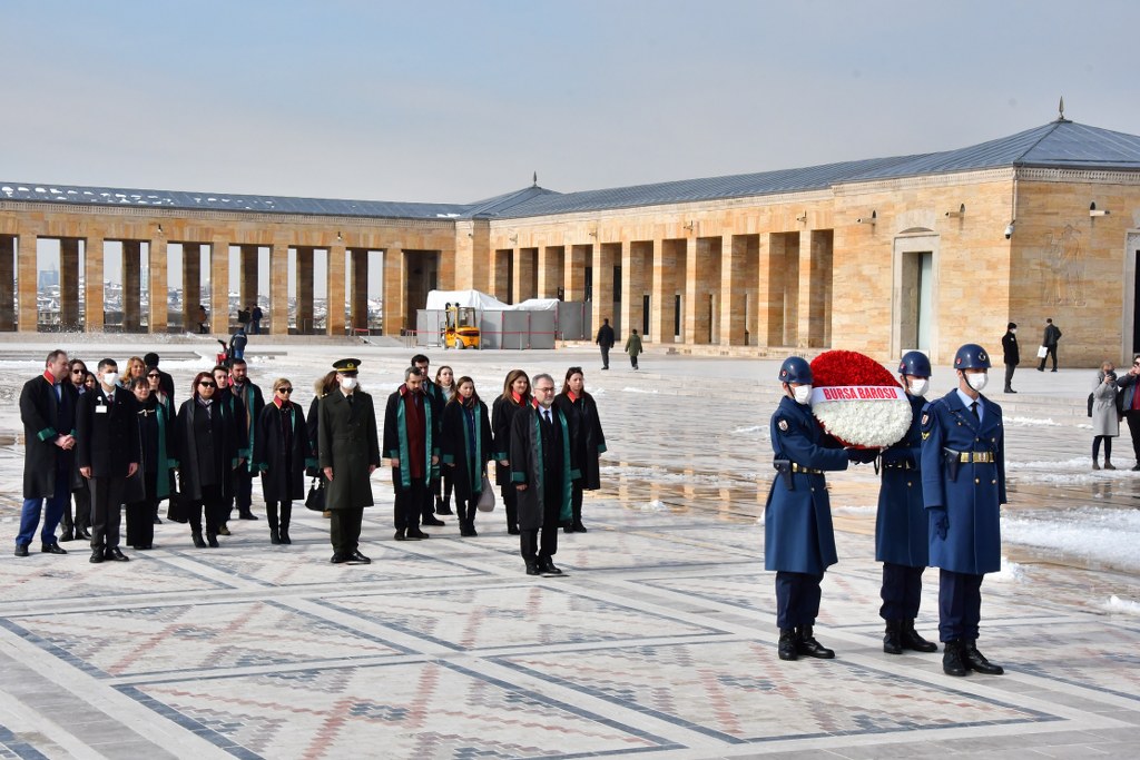 Bursa Barosu heyeti, Ankara ziyaretinin ikinci gününde Anıtkabir'de ölümsüz lider Mustafa Kemal Atatürk'ün huzurundaydı. Bursa Barosu Başkanı Av. Metin Öztosun başkanlığındaki kurul üyeleri, cübbeleriyle Aslanlı Yol'da yürüdü. Öztosun, askeri törenle Atatürk'ün mozolesine çelenk sundu. Heyet, bir dakikalık saygı duruşunun ardından Misak-ı Milli Kulesi'ne geçti. Bursa Barosu Başkanı Av. Metin Öztosun, şeref defterine şunları yazdı: