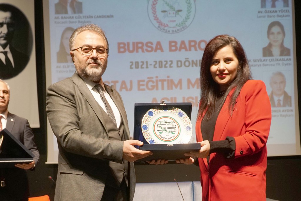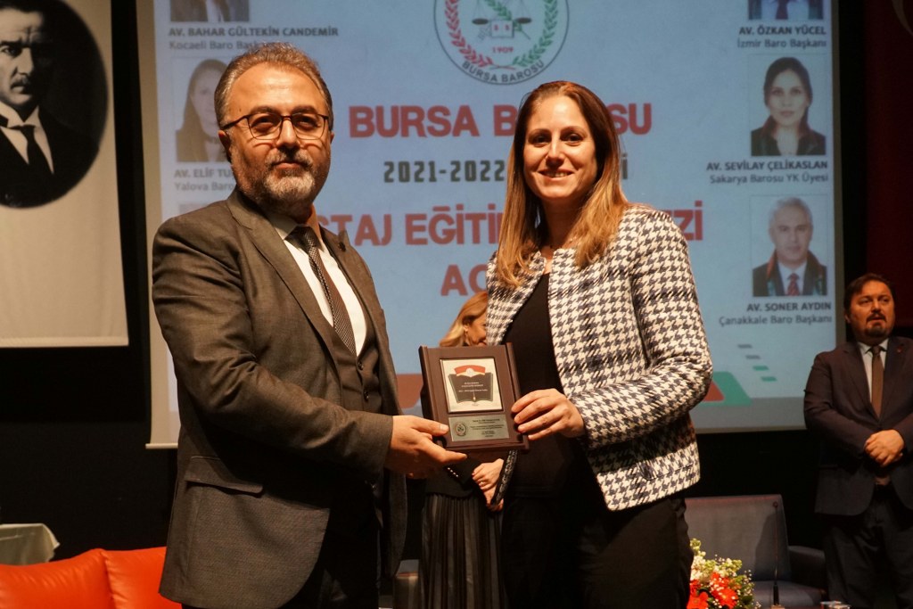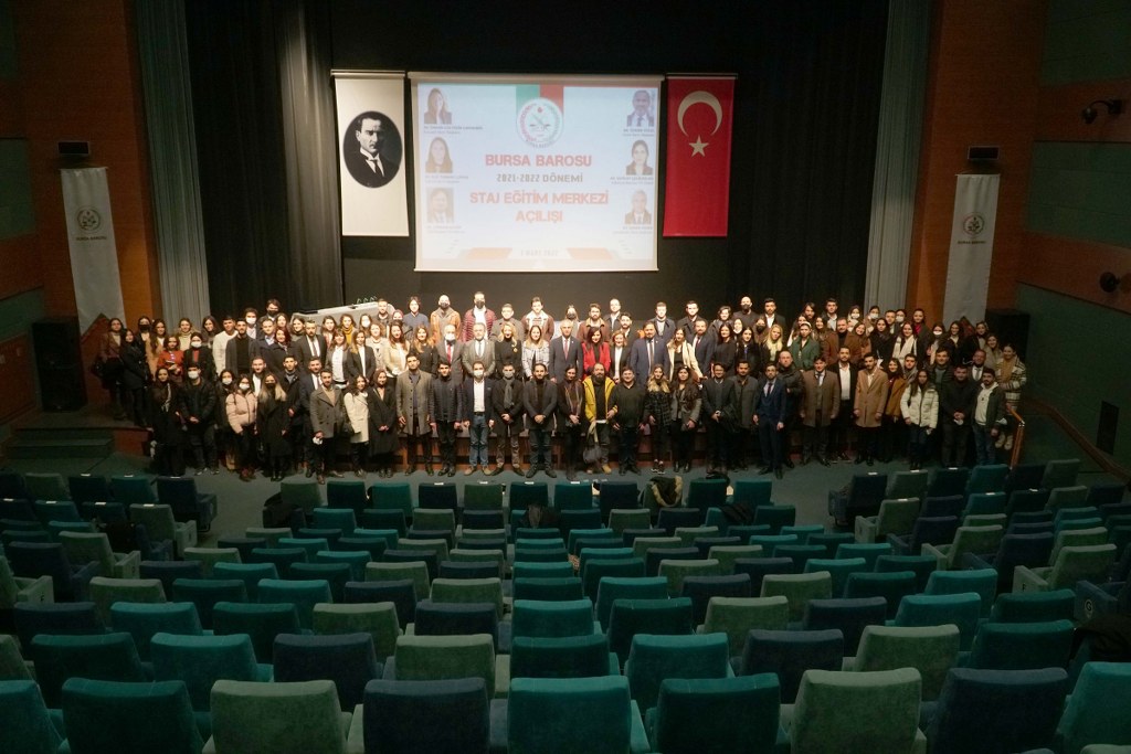 Bursa Barosu 2021-2022 Dönemi Staj Okulu 587 stajyerle, TBB Başkan Yardımcısı Av. Gürkan Altun, Kocaeli Barosu Başkanı Av. Bahar Gültekin Candemir, Çanakkale Barosu Başkanı Av. Soner Aydın, Yalova Barosu Başkanı Av. Elif Turnacı Çavuş ve Sakarya Barosu Yönetim Kurulu Üyesi Av. Sevilay Çelikaslan'ın katılımıyla açıldı.