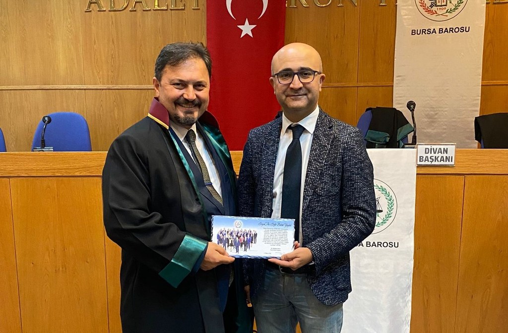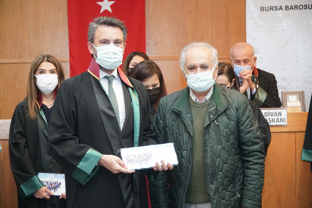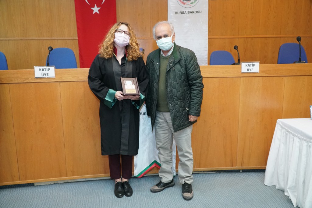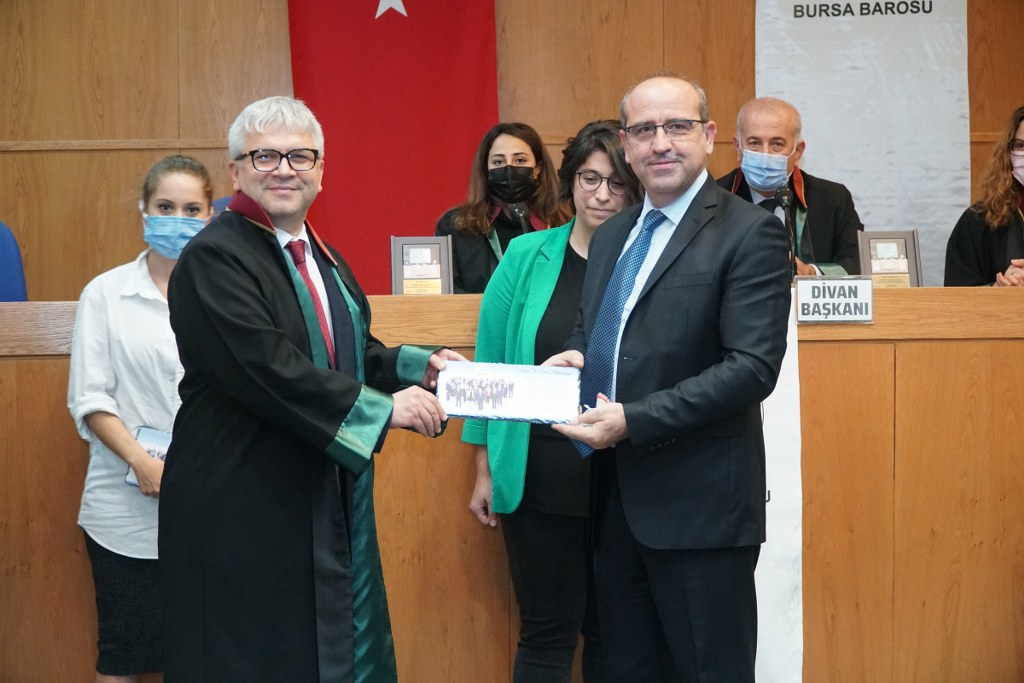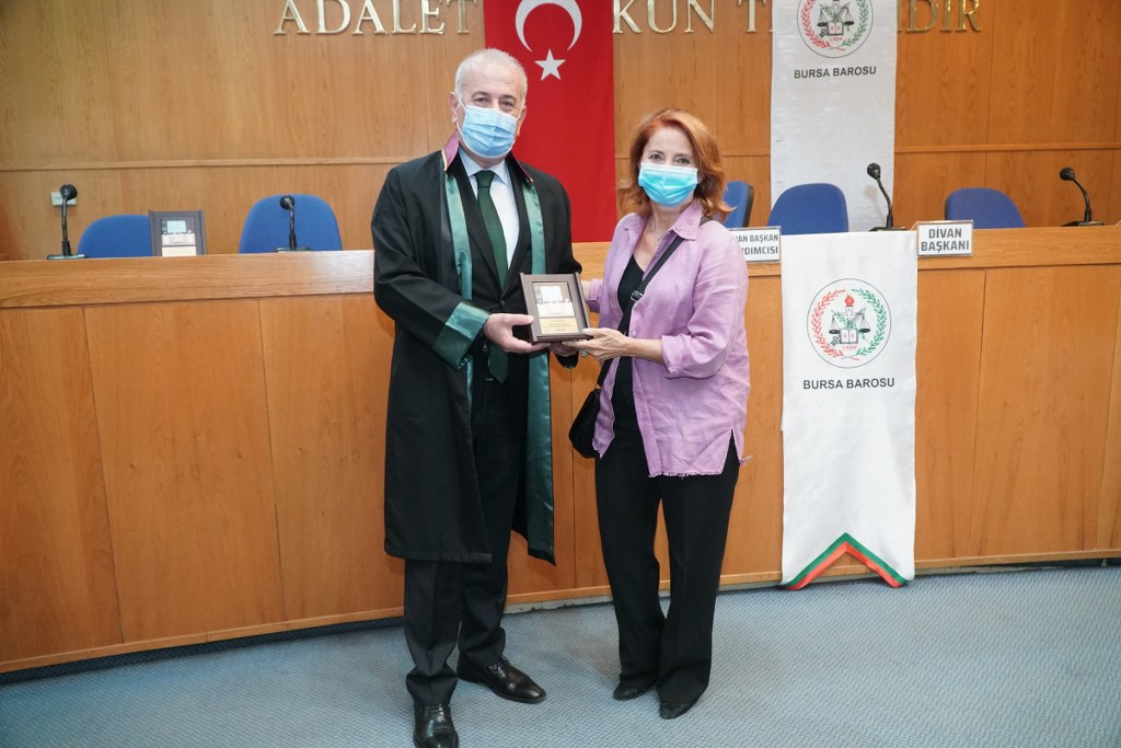 Bursa Barosu Başkanlık makamında da, geçen dönem yönetim kurulu üyeleri, Bursa Barosu Başkanı Altun'a plaket verdi.