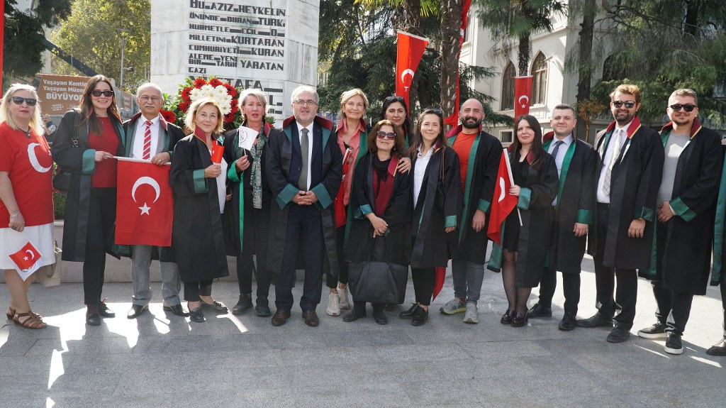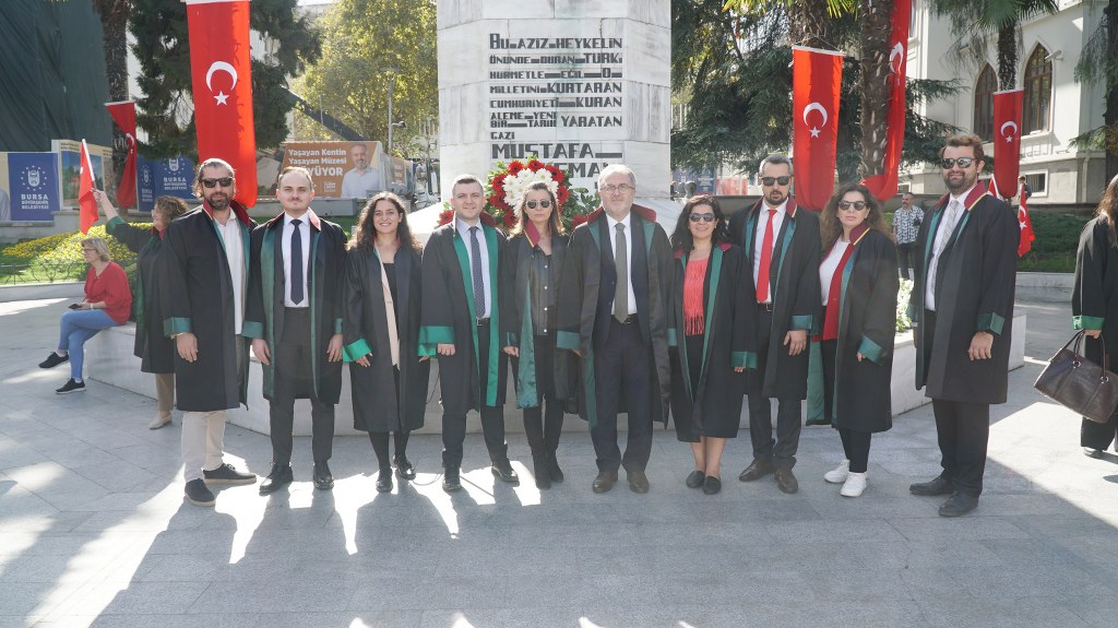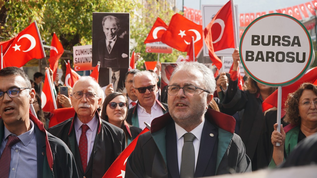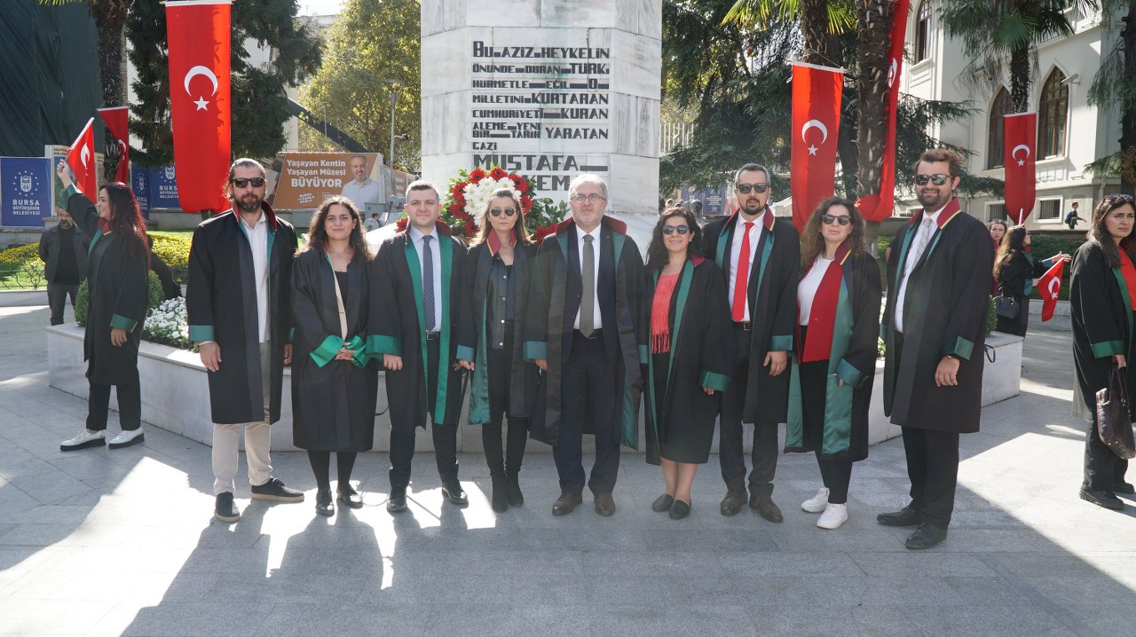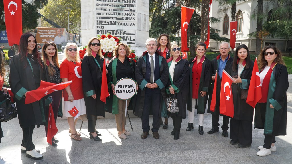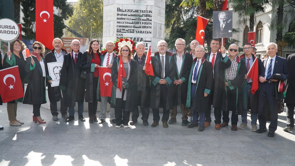 Bursa Barosu'nun geleneksel hale getirdiği “Cumhuriyeti Savunuyoruz” pankartı arkasındaki cumhuriyet yürüyüşü, Cumhuriyetin 100. yılı nedeniyle daha anlamlı ve coşkulu oldu. Bursa Setbaşı Mahfel önünde toplanan Bursa Barosu üyesi avukatlar, marşlar okuyarak Atatürk Anıtı önüne yürüdü. Bursa Barosu önceki başkanları Av. İsmail Acar, Av. Ali Arabacı ve Av. Asude Şenol'un da katıldığı yürüyüş sonrası, Bursa Barosu Başkanı Av. Metin Öztosun Atatürk Anıtı'na çelenk sundu. Bursa Büyükşehir Beledi Bandosu eşliğinde saygı duruşunda bulunulup İstiklal Marşı okundu. Bursa Barosu Yönetim Kurulu üyeleri ve avukatlar, Cumhuriyetin 100. yılı nedeniyle Atatürk Anıtı önünde anı fotoğrafı çektirdiler.