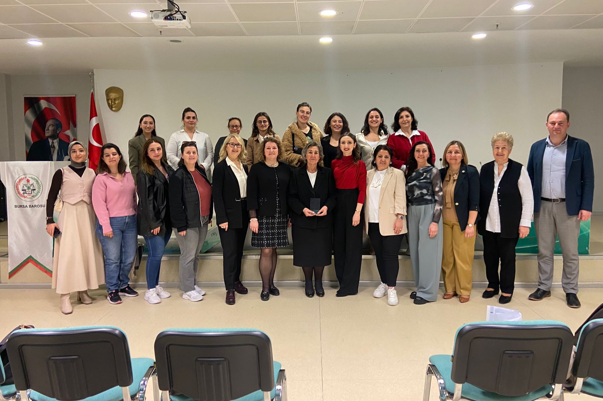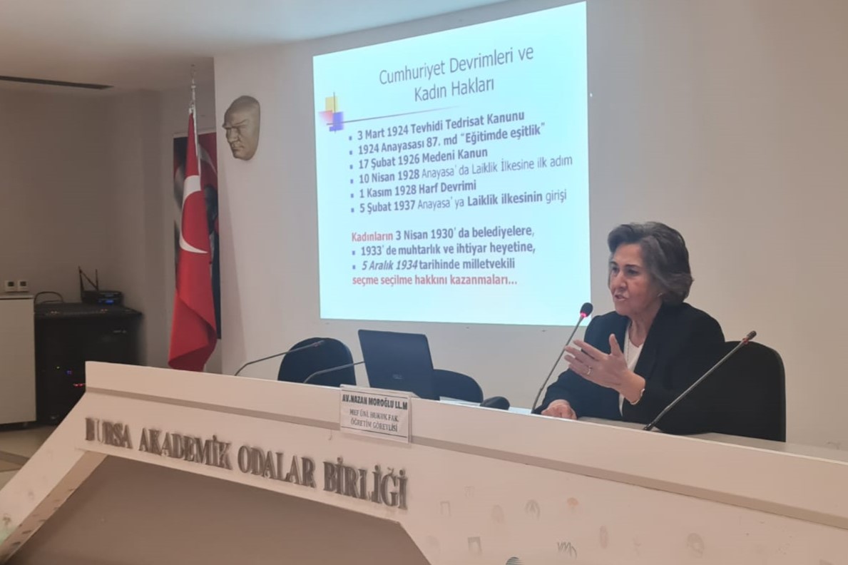 Bursa Barosu Kadın Hakları Merkezi'nce düzenlenen "Medeni Kanun, 6284 Sayılı Kanun ve Kadınların Kazanımları" konulu konferans BAOB Ortak Salon'da bugün gerçekleştirildi. MEF Üniversitesi Hukuk Fakültesi Öğretim Üyesi Av. Nazan Moroğlu'nun verdiği konferansı Bursa Barosu Başkanı Av. Metin Öztosun da izledi. Konferans sonunda Genel Sekreter Av. Yener Poroy, Moroğlu'na anı plaketi verdi.