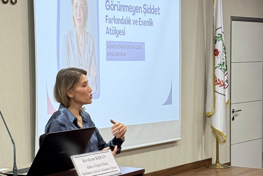 Bursa Barosu Kadın hakları Merkezi'nce 25 Kasım Kadına Yönelik Şiddetle Uluslararası Mücadele Günü etkinlikleri kapsamında düzenlenen "Görünmeyen Şiddet, Farkındalık ve Esenlik Atölyesi" Av. Özgür Aksoy Konferans Salonu'nda gerçekleştirildi. Bursa Barosu yönetim kurulu üyeleri Av. Müberra Gülen Aydın, Av. Gülender Adıgüzel Özcan, Kadın Hakları Merkezi Başkanı Av. Ceren İlgen Altuntaş ve KHM sorumlusu Av. Özlem Gürgen Eldem ile kadın avukatların katıldığı atölyede, Klinik ve Örgütsel Psikolog, Mindfulness ve Şefkat Yaklaşımları Eğitmeni Kıvılcım Kıran katılımcılarla görüşlerini paylaştı, soruları yanıtladı.