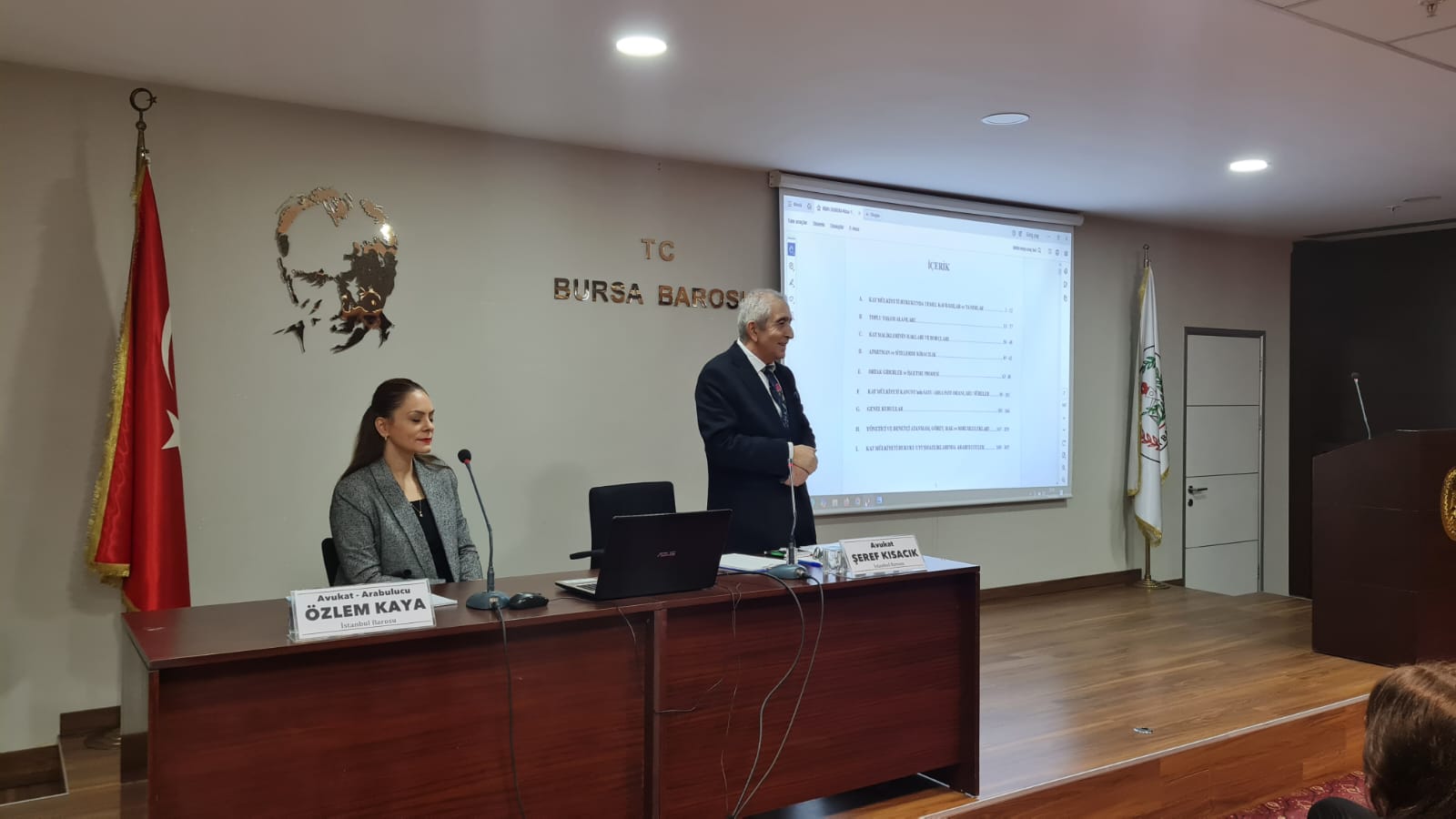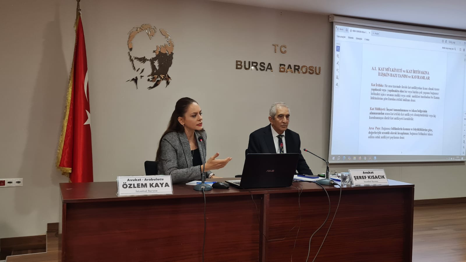 Bursa Barosu Eğitim Merkezi BUBEM tarafından düzenlenen "Kat Mülkiyeti Hukuku, Sorunlar ve Çözüm Yolları" başlıklı konferans Av. Özgür Aksoy Salonu'nda gerçekleştirildi. İstanbul Barosu'ndan Av. Şeref Kısacık ve Av. Arb. Özlem Kaya'nın verdiği konferansı Bursa Barosu Başkanı Av. Metin Öztosun ile yönetim kurulu üyeleri ve avukatlar izledi. Konferans sonunda Öztosun, Kısacık ve Kaya'ya anı plaketi verdi.
